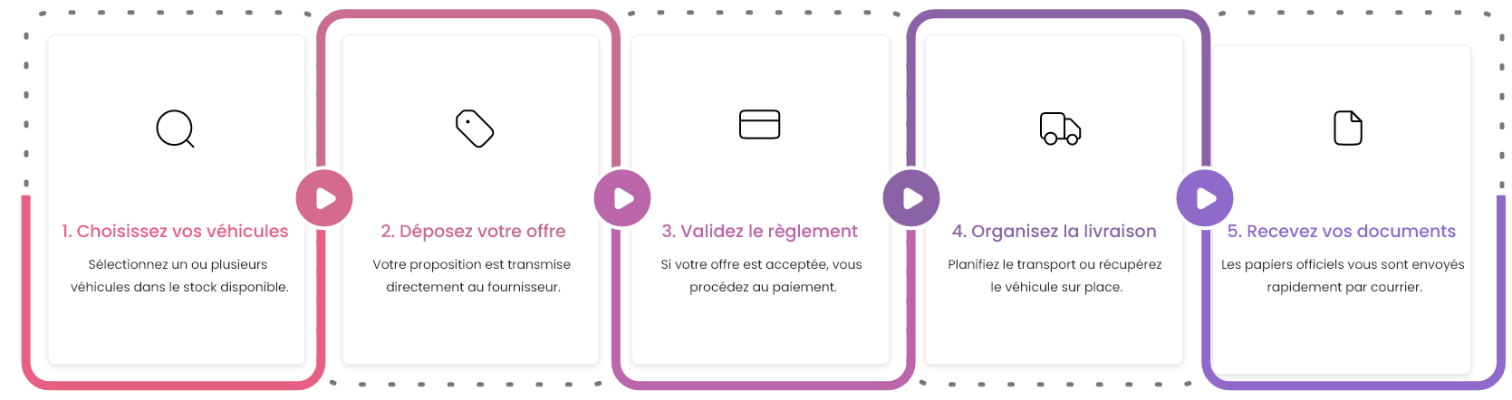 Il suffit de cliquer sur le bouton et un expert vous recontactera. Nous définirons ensemble un mode de récupération de vos véhicules (Excel, API, logiciel, etc.) incluant les photos et les bilans techniques. Vos véhicules seront ensuite diffusés sur notre plateforme. Lors de la vente d’un véhicule, les modalités définies ensemble seront appliquées.